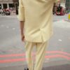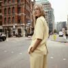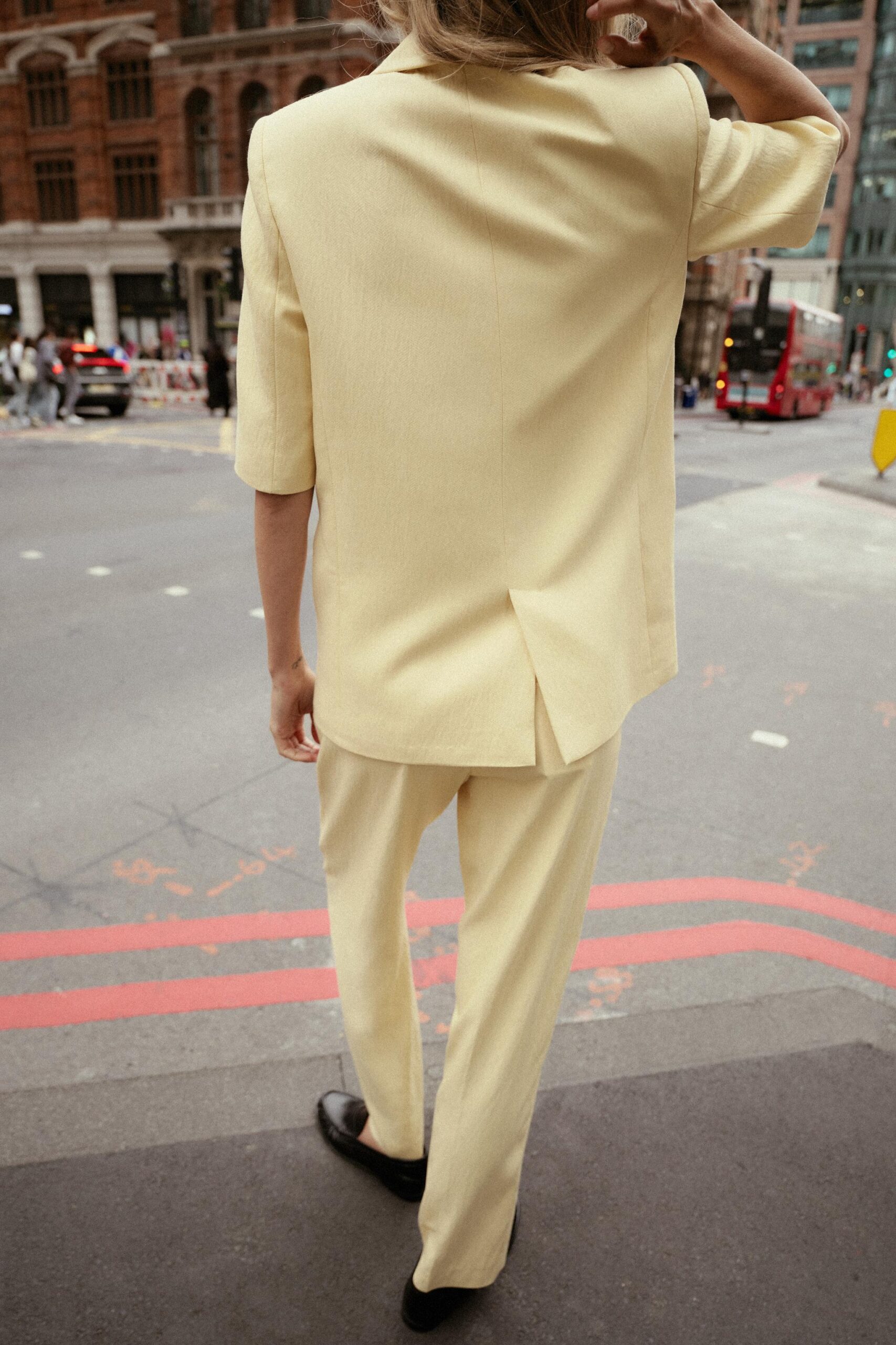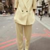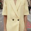 Blazer with a lapel collar and short sleeves, featuring shoulder pads. Front welt pockets. Lined. Double-breasted button fastening.