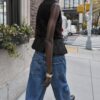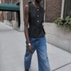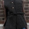 Round neck, sleeveless waistcoat. Featuring a matching fabric-lined belt. Structured fabric with a metallic thread. Hem with darts. Front button fastening.