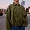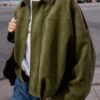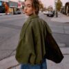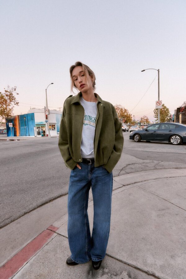 Long sleeve bomber jacket with a lapel collar and shoulder tabs. Hem finished with pleats and volume. Front fastening with a fly front and hidden buttons.