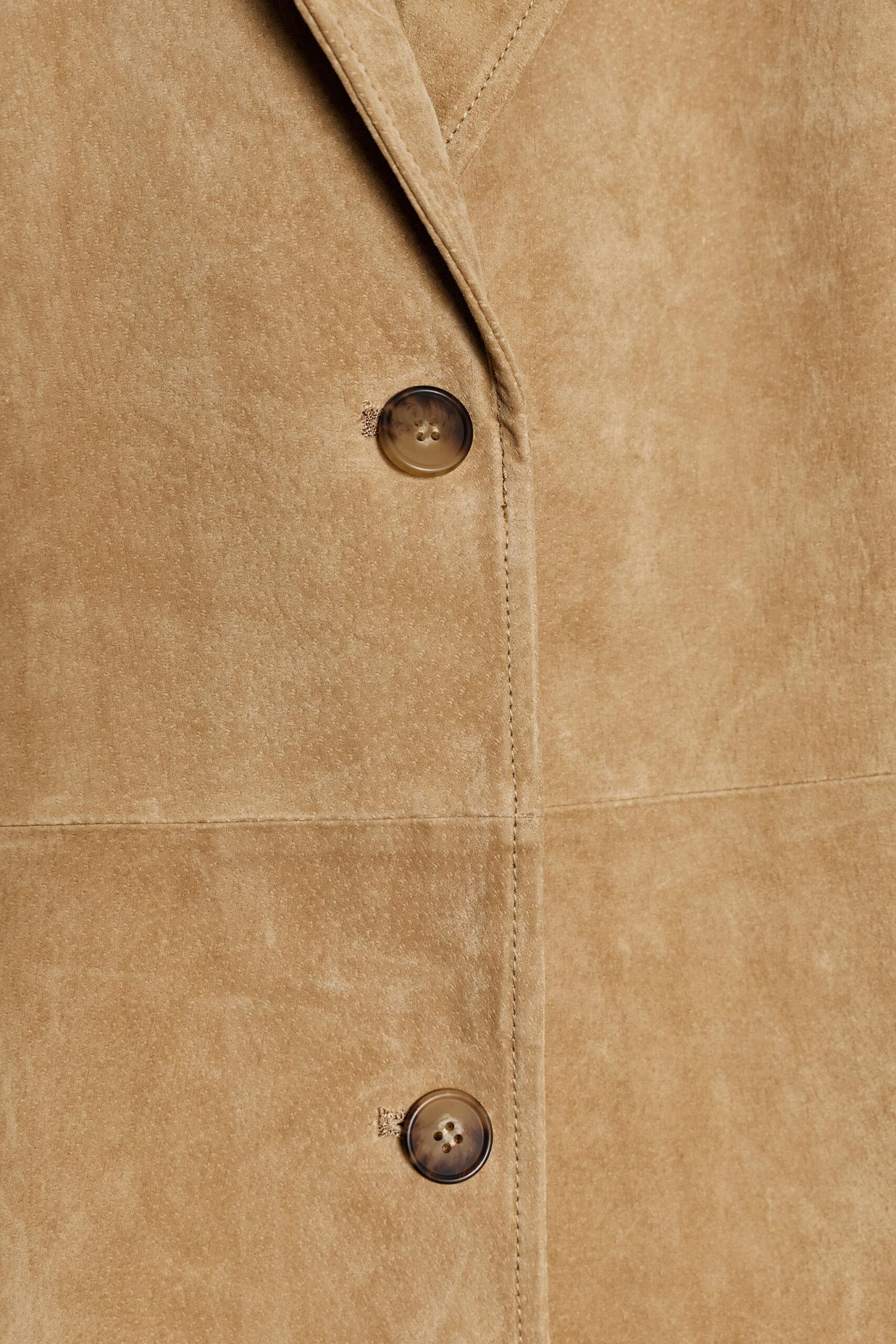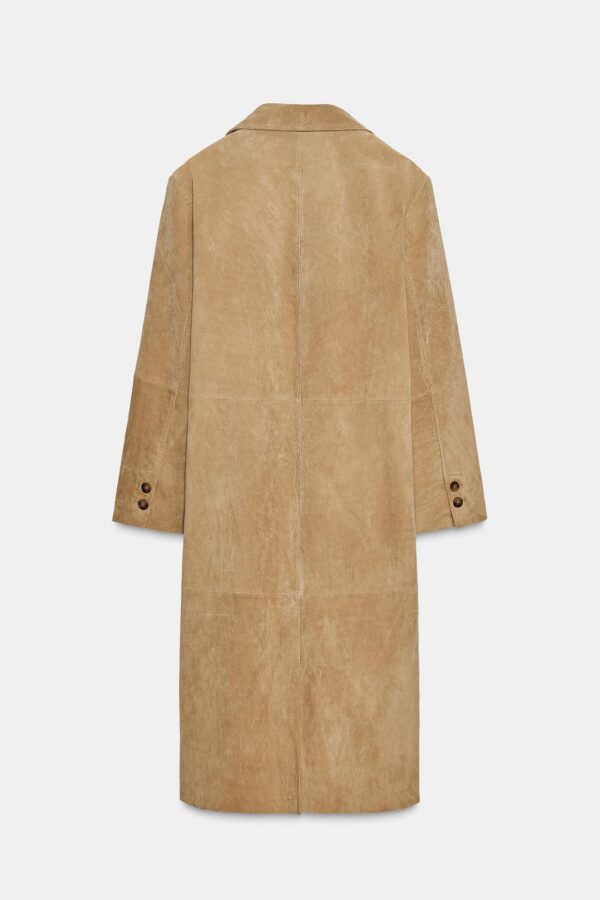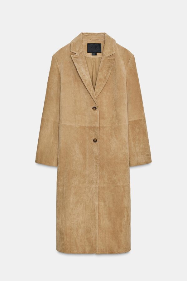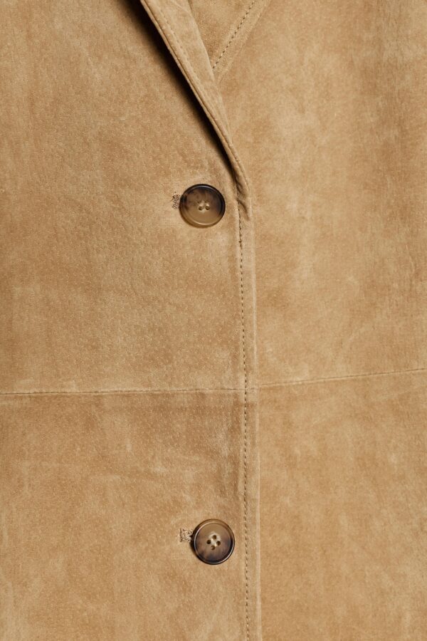Coat made from 100% suede leather. Notched lapel collar and long sleeves with vents and buttons. Front pockets. Matching lining. Hem finished with a vent at the back. Button fastening at the front.