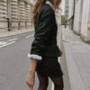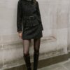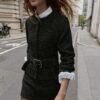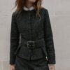Round neck blazer with long sleeves. Featuring a matching fabric-lined belt. Hidden front snap button fastening.