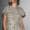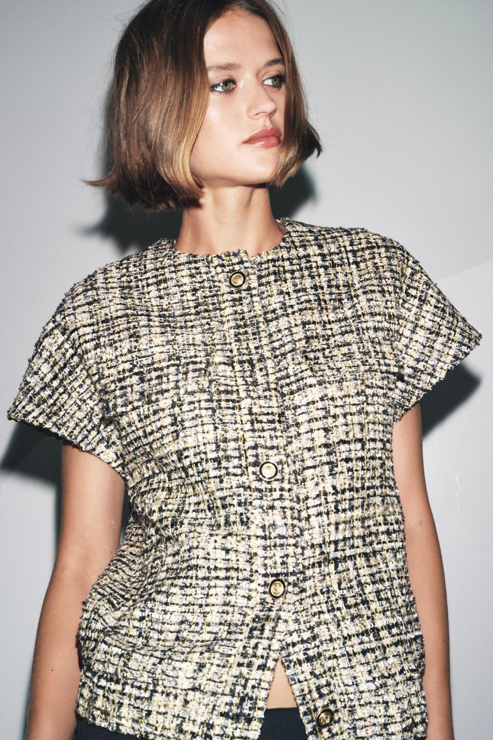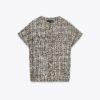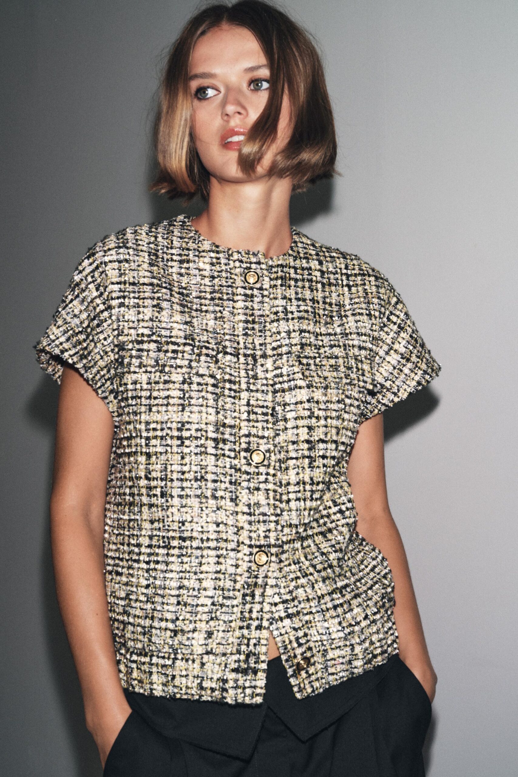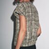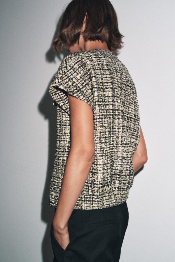 Short sleeve, round neck waistcoat. Textured fabric detail. Straight hem. Front fastening with raised metal buttons.