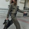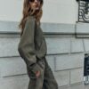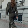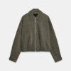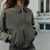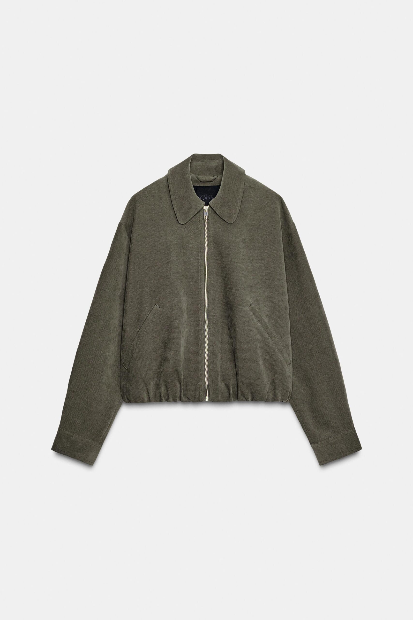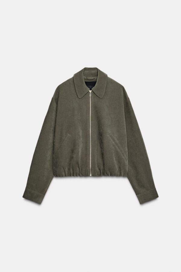 Long sleeve bomber jacket with a lapel collar. Front welt pockets. Elastic hem. Front zip fastening.