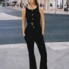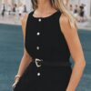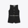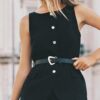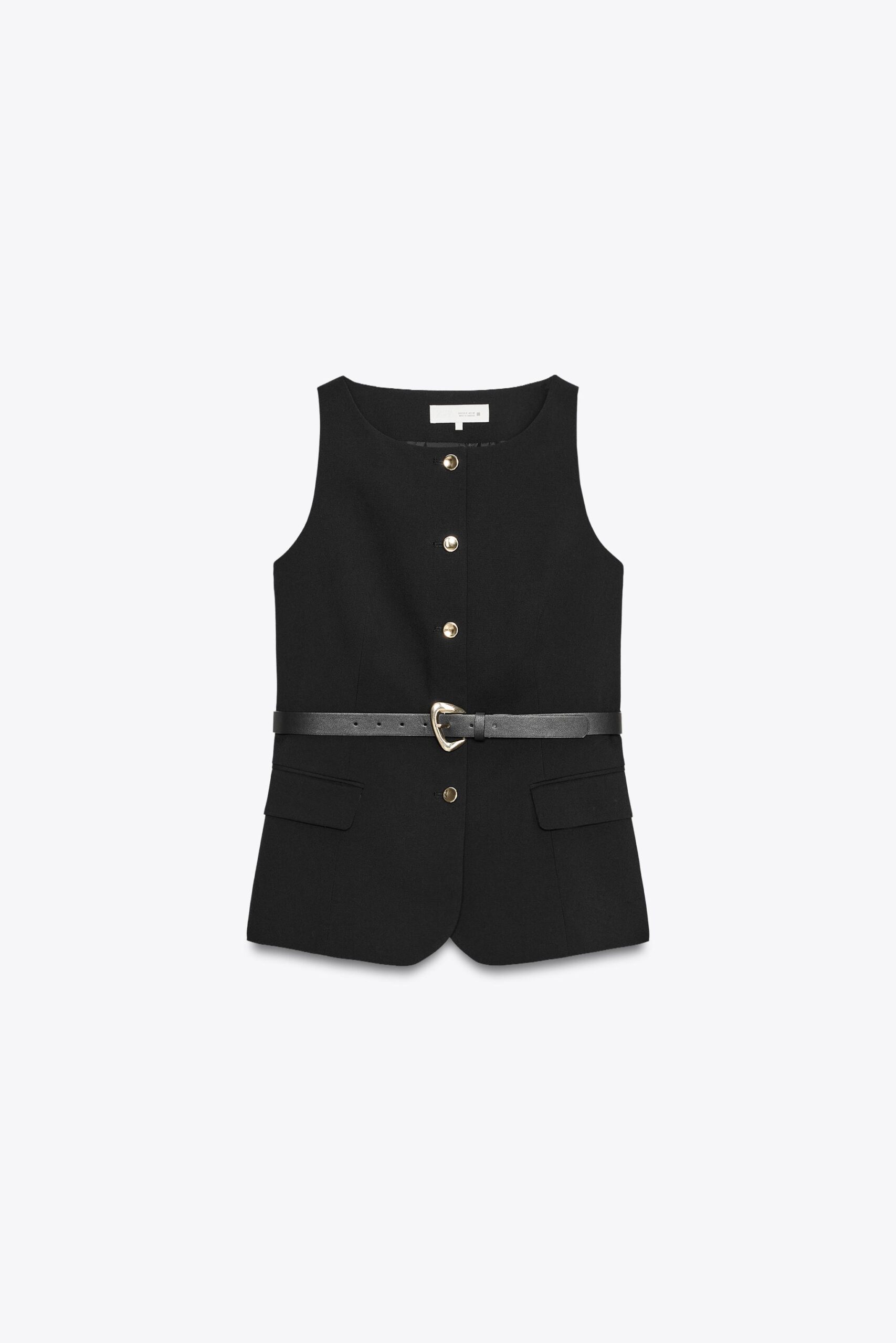 Round neck gilet with sleeveless design. Front flap pockets. Interior lining. Matching belt with metal buckle. Metal button-up front.