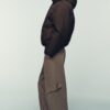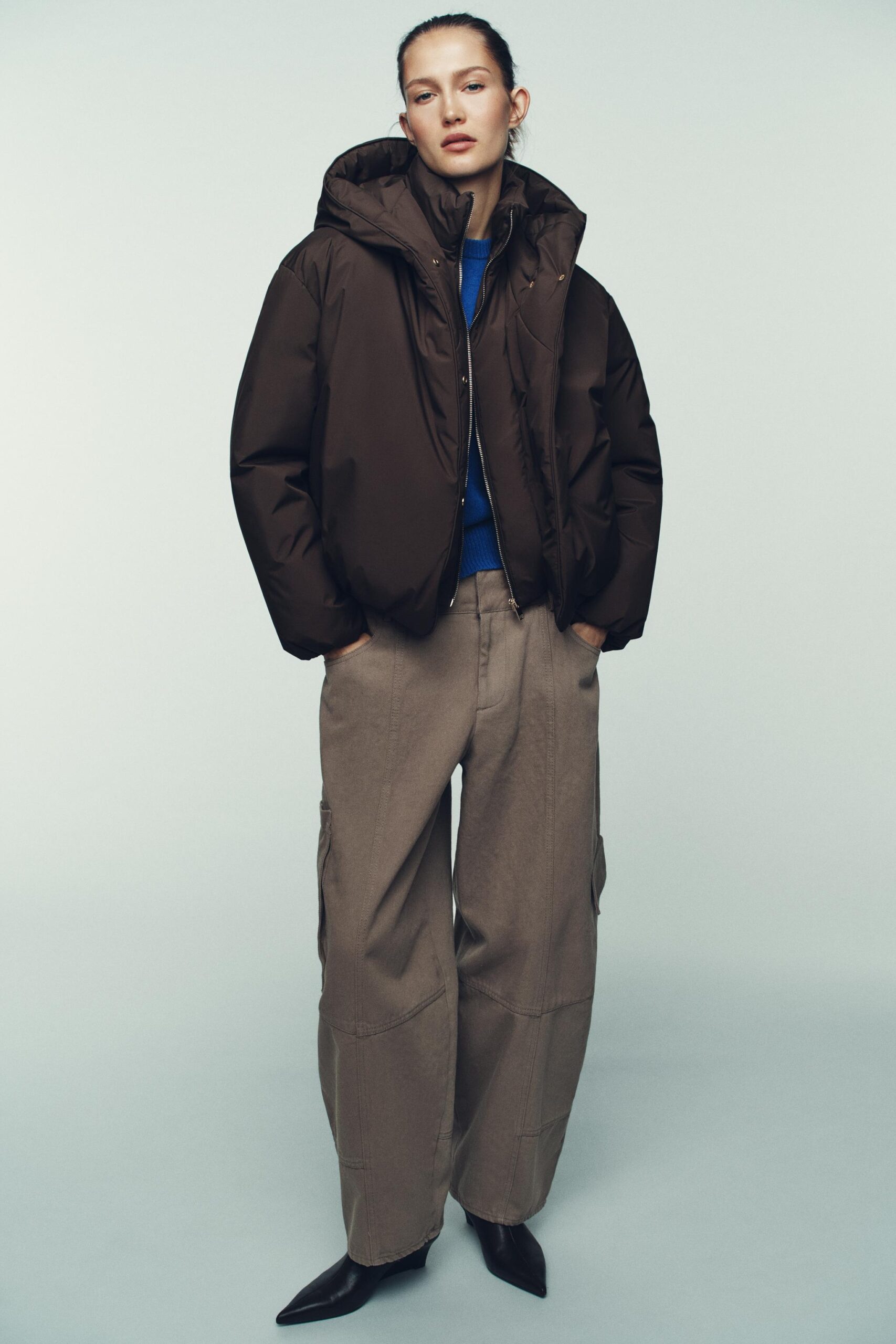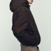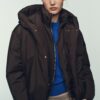 High collar with hoodie and long sleeve with elastic cuffs. Front pockets with fleece lining. Elasticated hem. Front zip fastening and concealed snap buttons.
