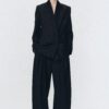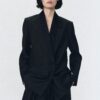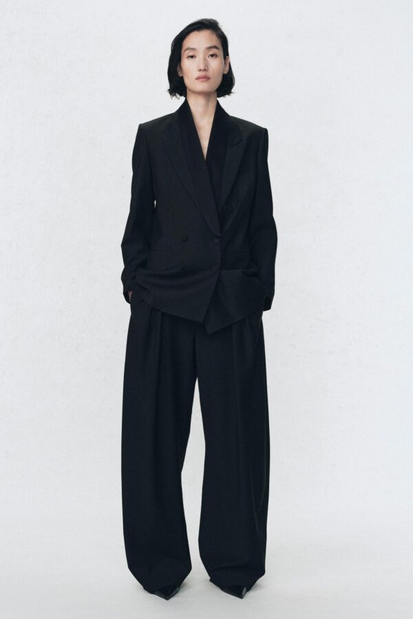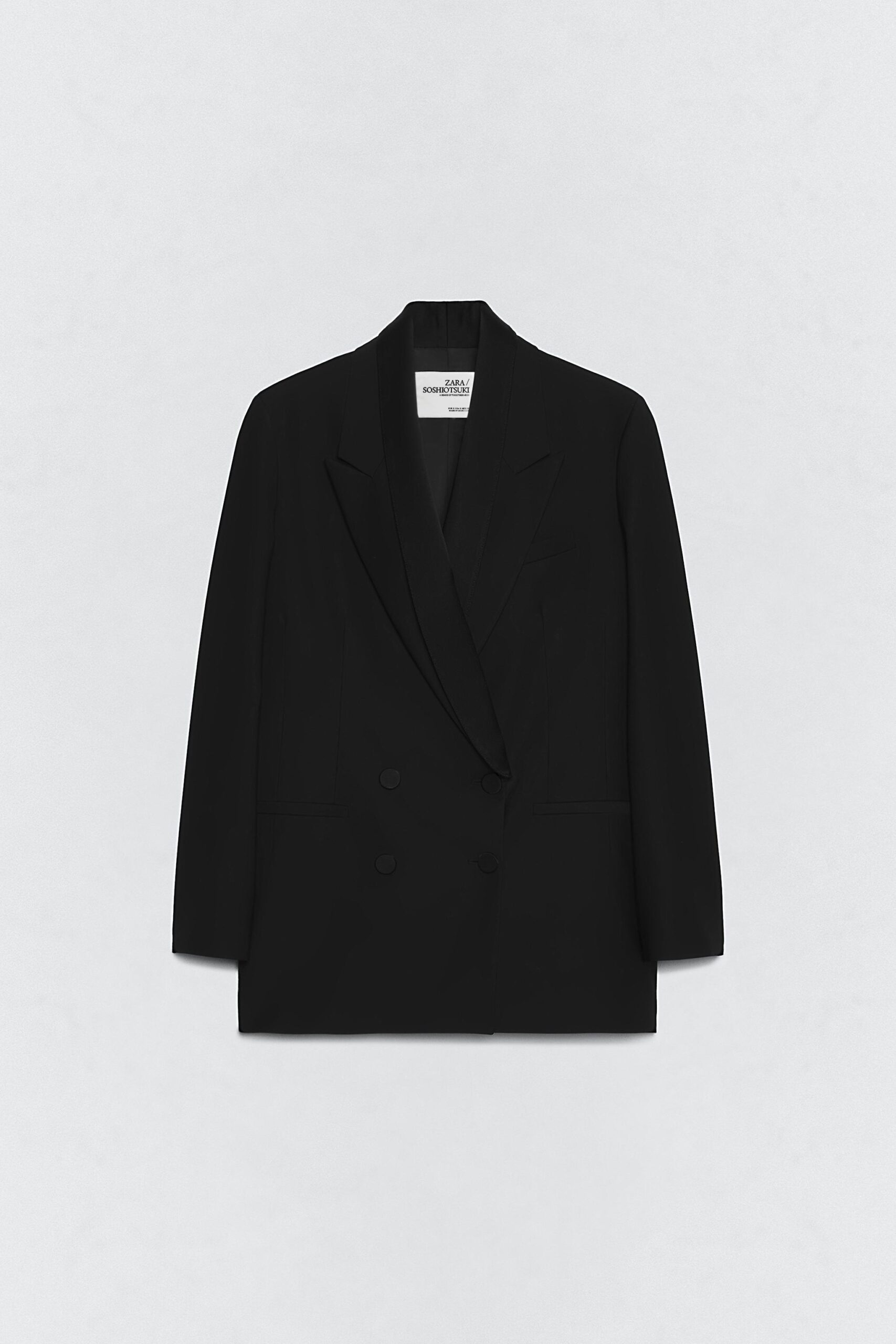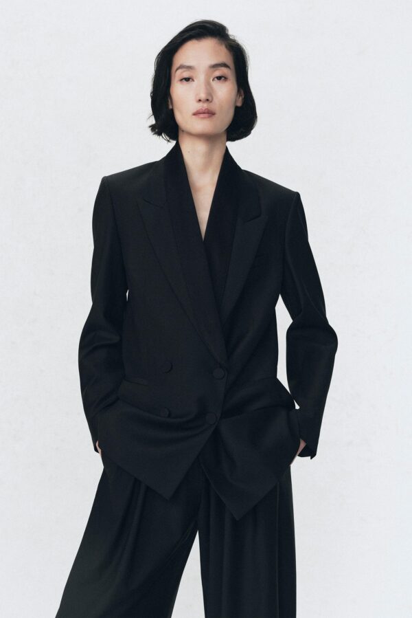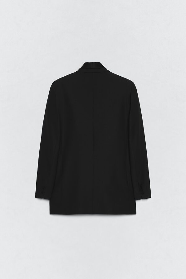 Blazer made from a wool blend yarn. Double notched lapel collar and long sleeve with vent and buttons. Front welt pockets. Tonal inner lining. Double-breasted button fastening with covered buttons.