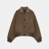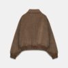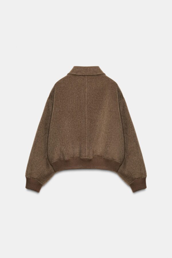 Bomber jacket made from a wool-blend yarn. Lapel collar and long sleeves with cuffs. Front in-seam pockets. Elasticated ribbed hem. Front button fastening.