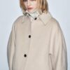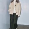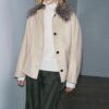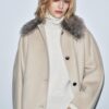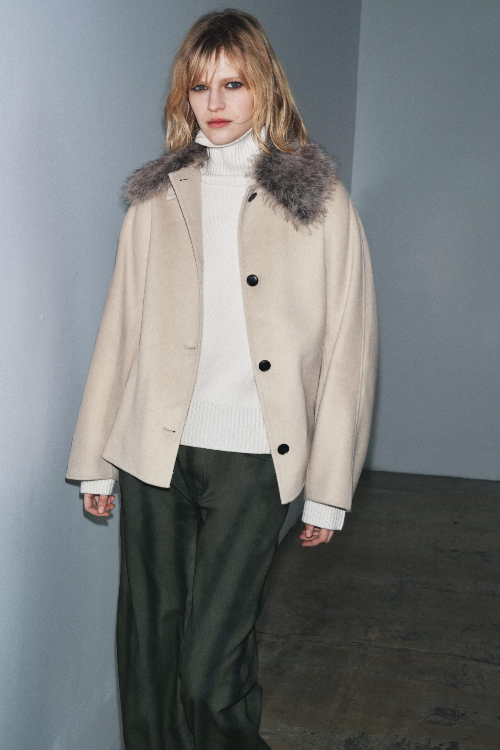 Jacket made from a wool-blend yarn. Lapel collar with detachable faux fur trim. Long sleeves. Front pockets hidden in the seam. Straight hem. Front button fastening.