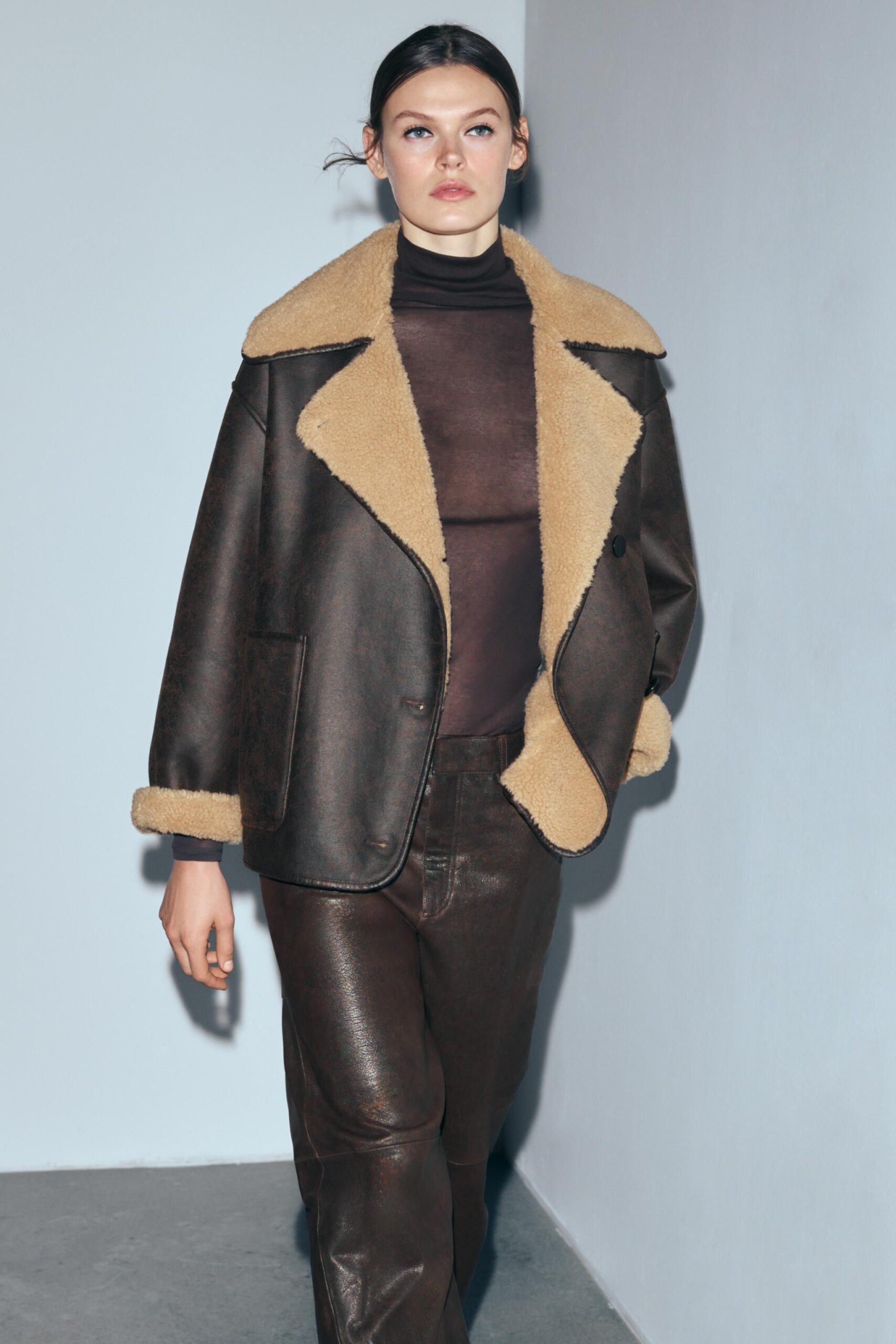 Jacket with a lapel collar and long sleeves. Patch pockets on the front. Faux shearling lining. Front button fastening.