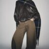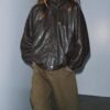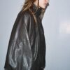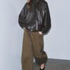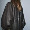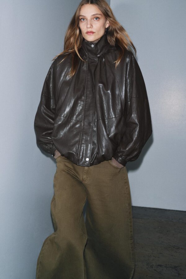 Bomber jacket in a leather effect fabric. Features a high neck and long sleeves. Front pockets. Puffed hem. Tonal lining. Zip-up front with a placket concealing snap buttons.