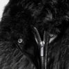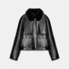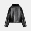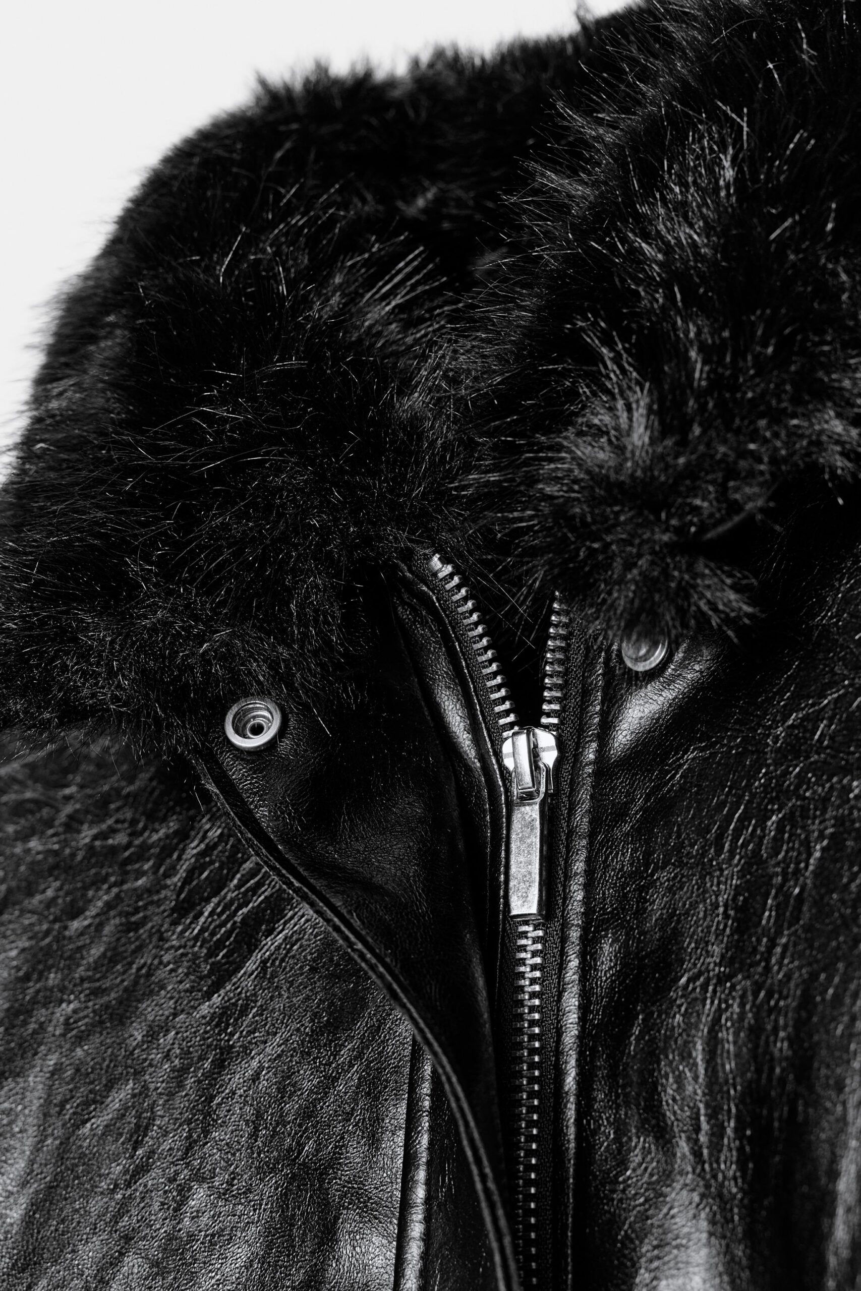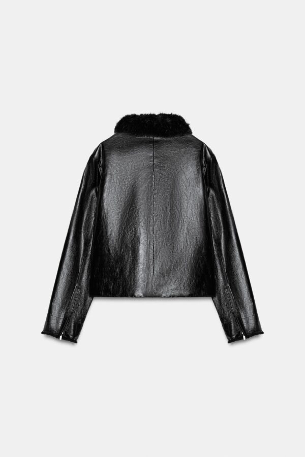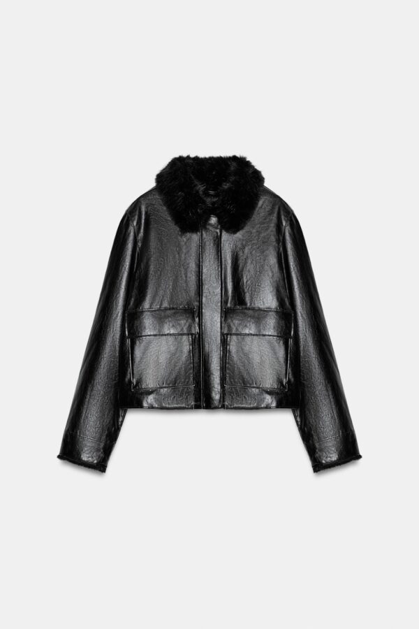 Jacket with main leather effect fabric. Lapel collar with faux fur application and long sleeves. Front patch pockets with flap. Zip-up front with hidden buttons by a placket.