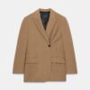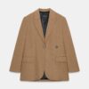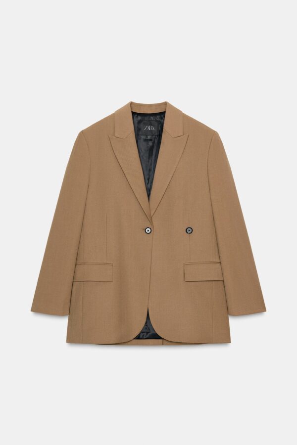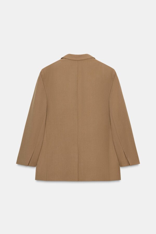 Loose-fitting blazer with a notched lapel collar and long sleeves. Featuring front flap pockets and a double-breasted button fastening.