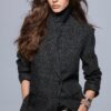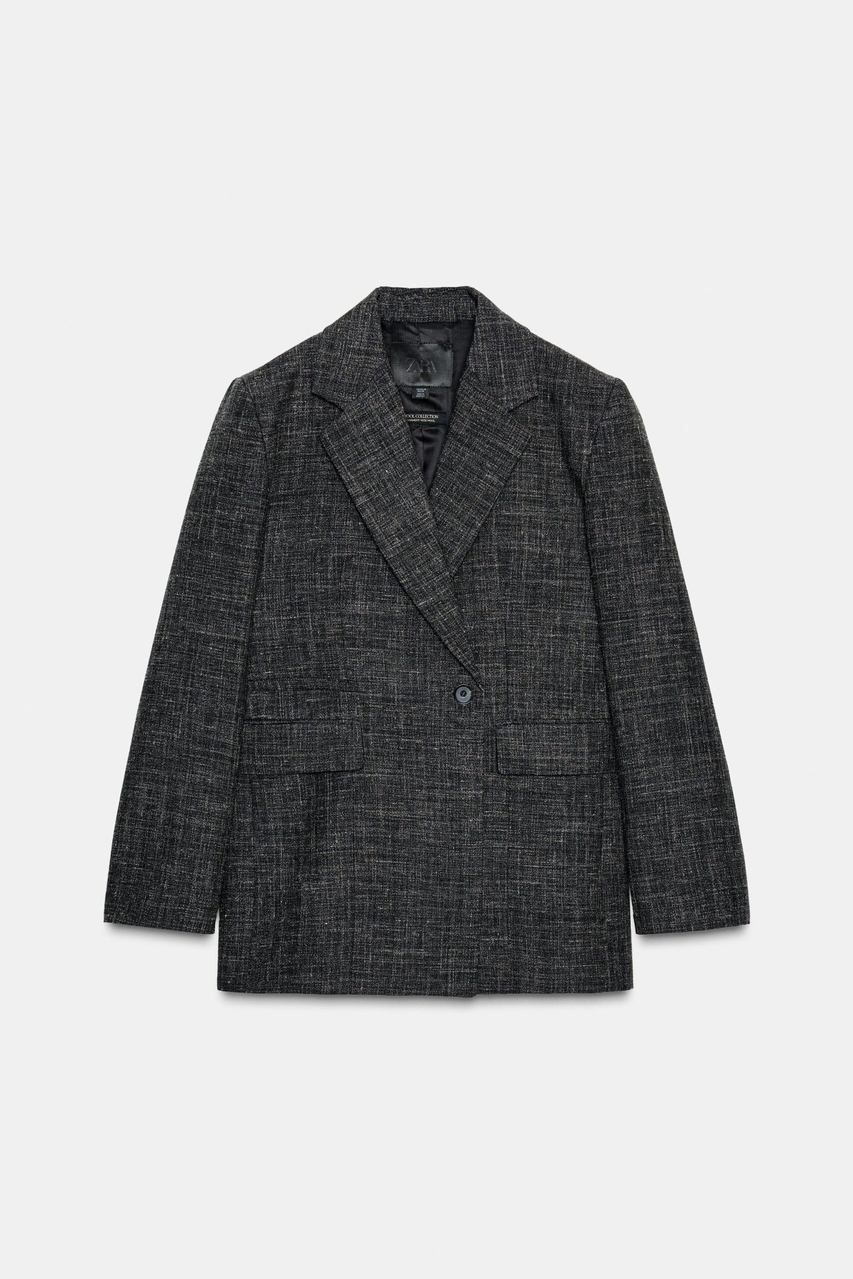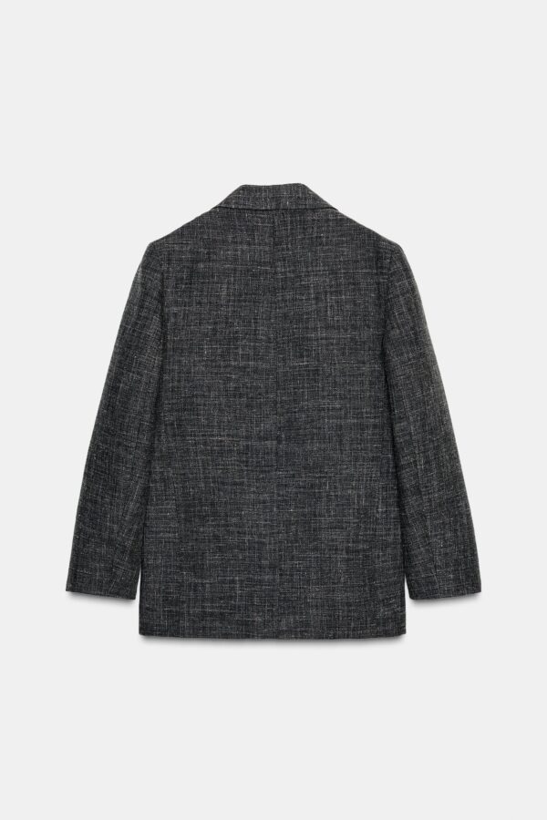 Straight blazer made of spun wool. Features a notched lapel collar and long sleeves with vents and buttons. Front pockets. Inner lining. Front double-breasted button fastening.